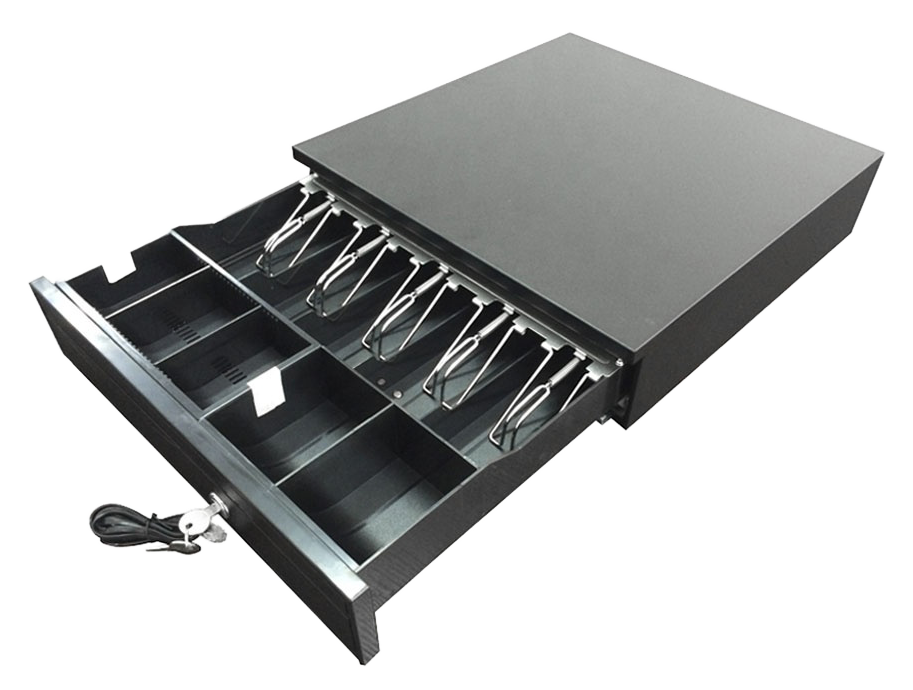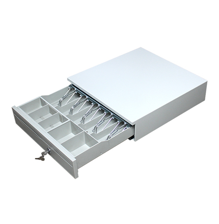 Heavy-duty metal design (thick robust steel) with 2 keys included. All steel construction, with stainless steel front. Black or off-white powder coated finish. Three function center key lock: manual release, electronic release and drawer lock. Standard ABS plastic 5 bill with 5 or 8 coin removable money trays insert. Five stainless steel spring-loaded clips for bills/checks.